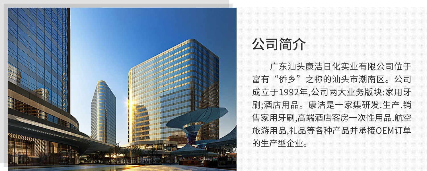 • 汕頭康潔日化實(shí)業(yè)有限公司是一家集研發(fā).生產(chǎn).銷售高端酒店客房一次性用品等各種產(chǎn)品并承接OEM訂單的生產(chǎn)型企業(yè)。
